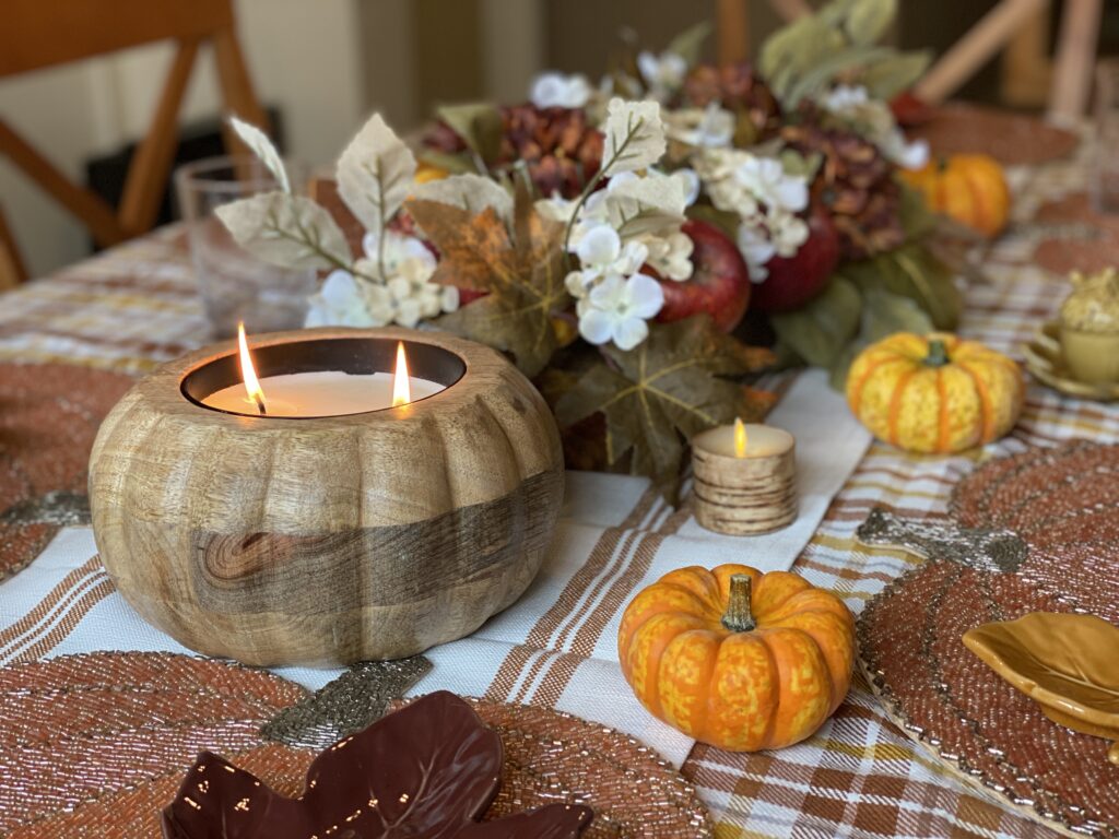 You know me and my decor… I just can’t get enough! The same applies to my Thanksgiving table. This gorgeous wood pumpkin candle will sit alongside my centerpiece.