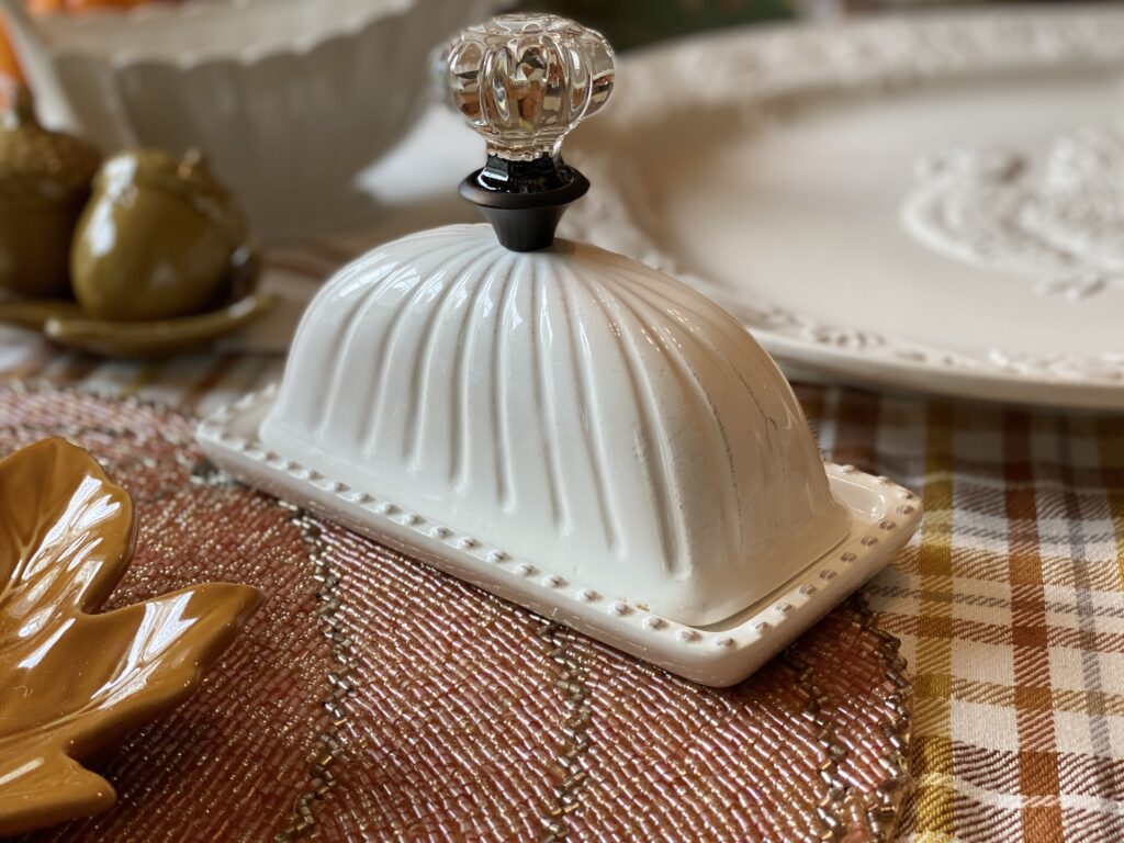 Sticking with the white theme, I’m added this butter dish to my table. Something about the pretty handle caught my eye. Frankly, I’m a little obsessed with this piece. It adds a little bit of elegance! I’ll be using this long after Thanksgiving dinner is over!