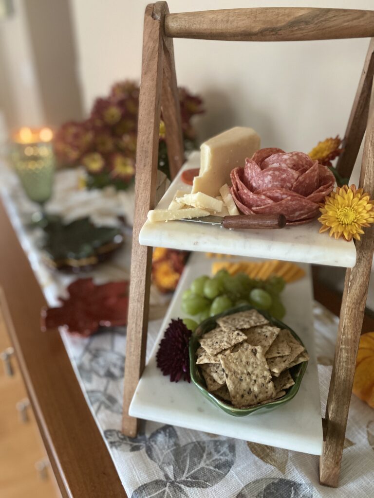 Instead of bringing the appetizers to the table, I like to set mine on a side table instead. I love this wood and marble stand that makes presenting meats, cheeses, and crackers easy.