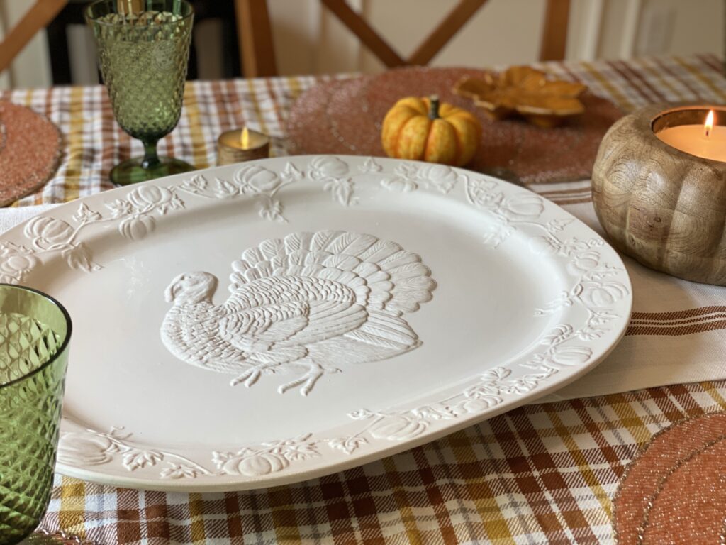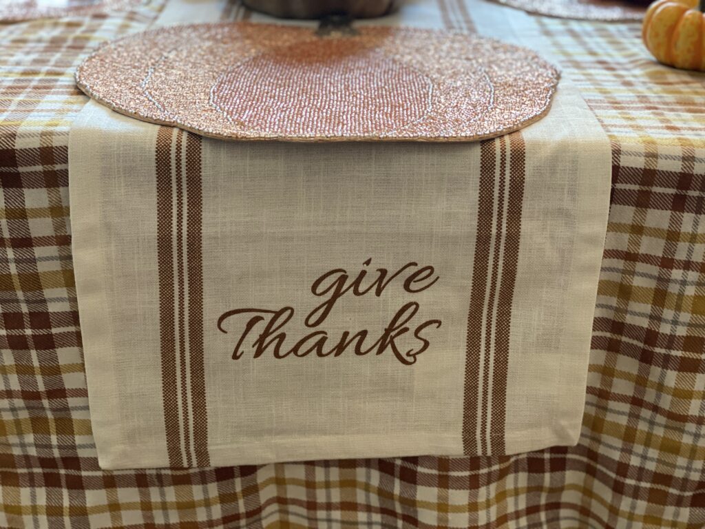 I like to start off by using some pretty table linens. This year, I’m using a plaid tablecloth topped with a “Give Thanks” runner. The layering really adds some dimension to the table!