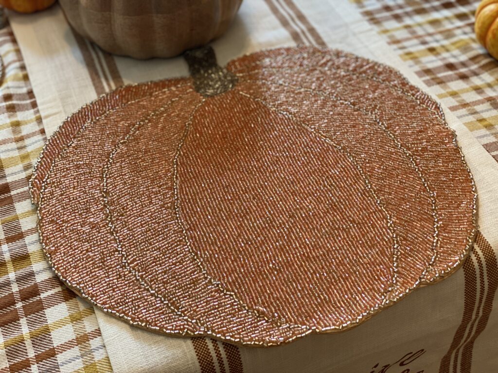 Five placemats also help your guests know where to sit before filling their bellies. I love the texture in this beaded pumpkin placemat. Don’t you?