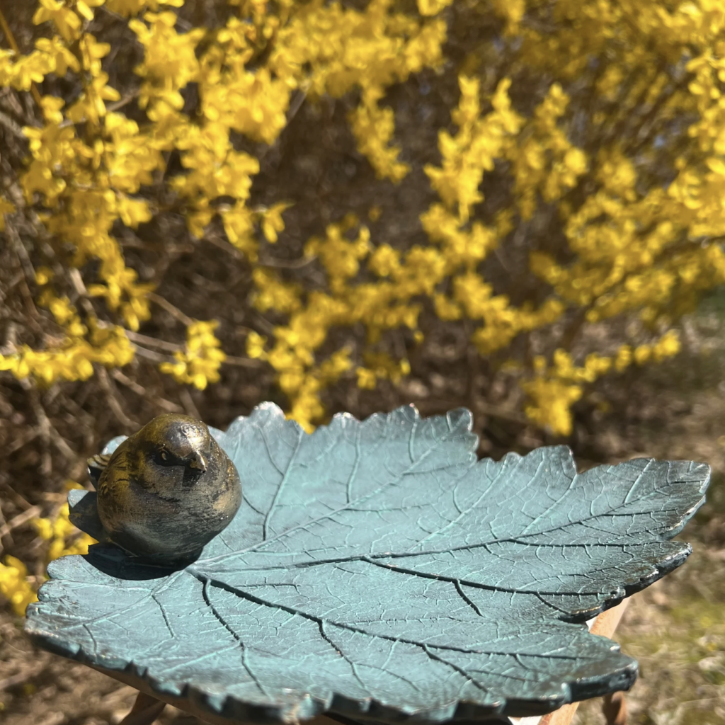 We have this sweet bird-on-leaf bird bath that brings a touch of decor to any garden.