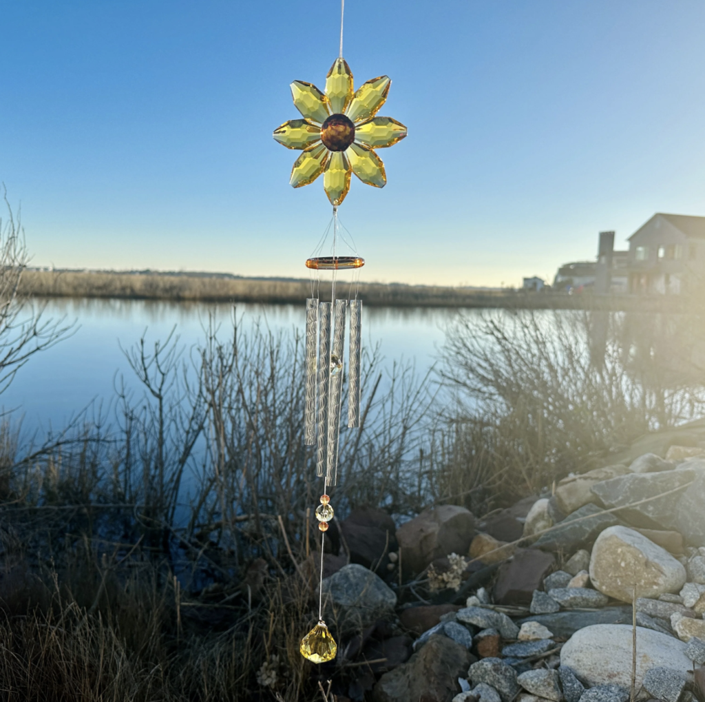 This is one of our newer gardening items at the shop! It’s a sunflower wind chime and it’s a favorite in my own garden!