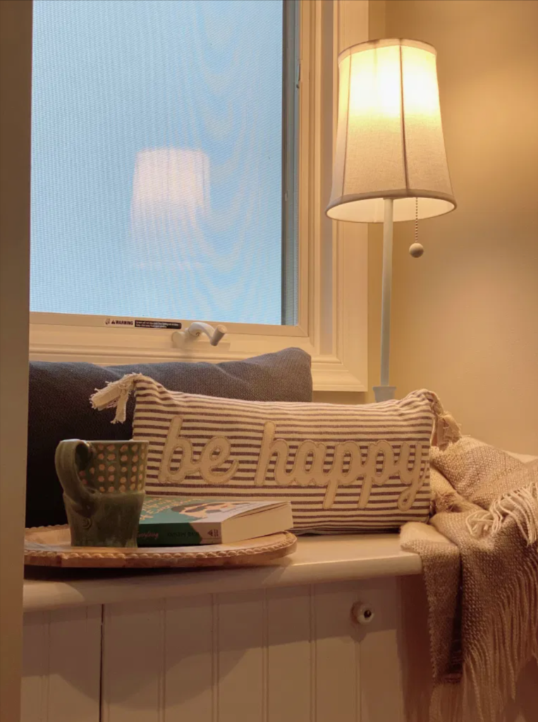 I created a cozy nook in this window seat with just one of the lamps. Are you ready to curl up with a cup of tea and do a little reading?