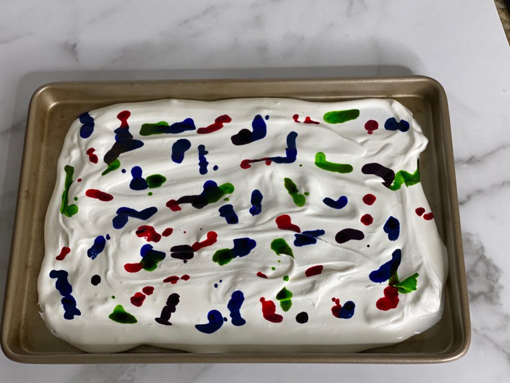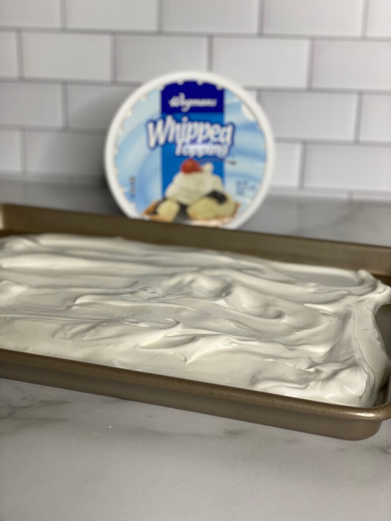 Take a rimmed cookie sheet and spread a layer of whipped topping (Cool Whip!).