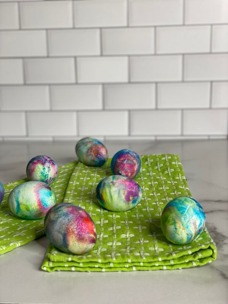 Roll your eggs through your tie-dye swirls. And don’t forget to cover the ends of the eggs.