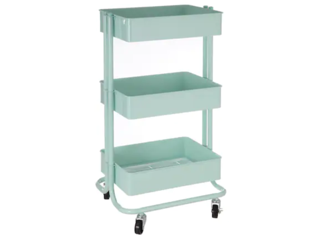 A rolling cart is a great place to put craft supplies like pens, markers, scissors, and more. Michaels sells a nifty cart that features three shelves and lots of space.