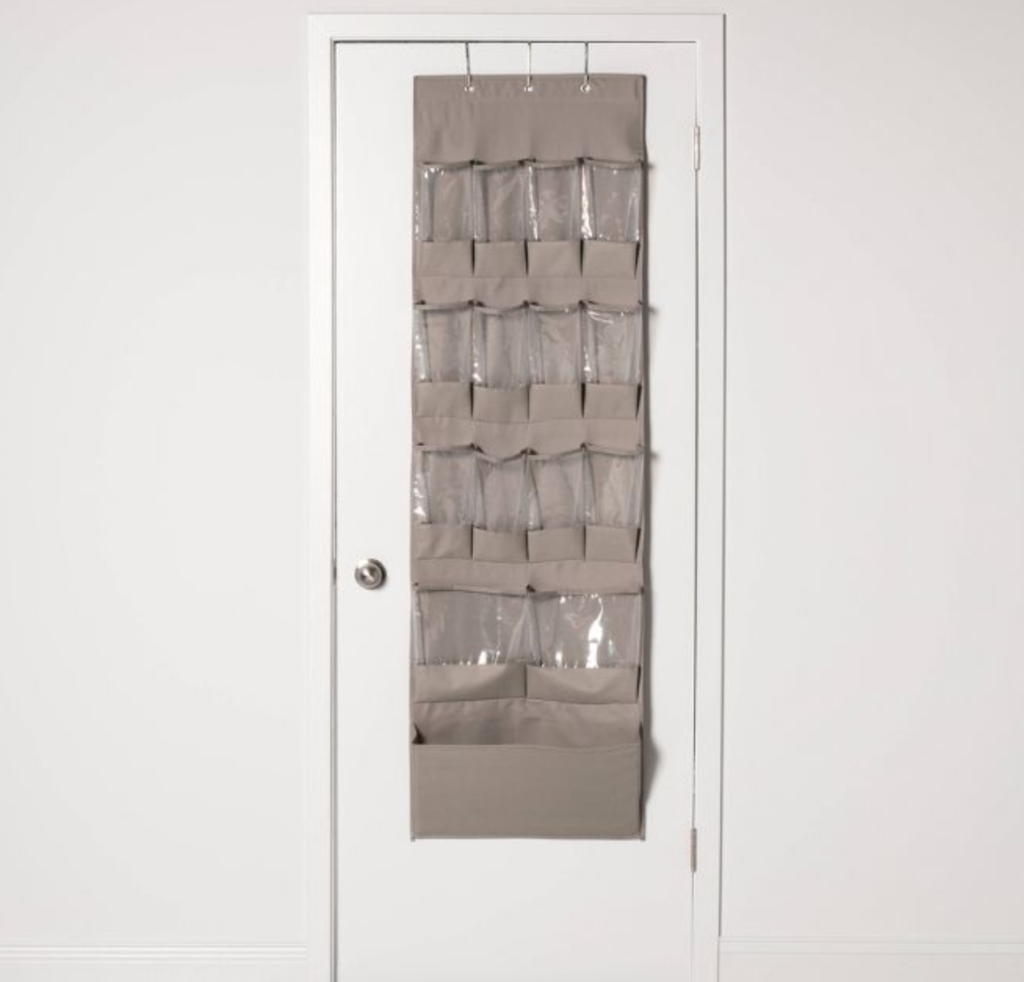 An over-the-door hanger is another great way to save space while keeping toys organized. Of course, this won’t work for larger items, but the little puches are great for things like paint brushes, small dolls, legos, and more.