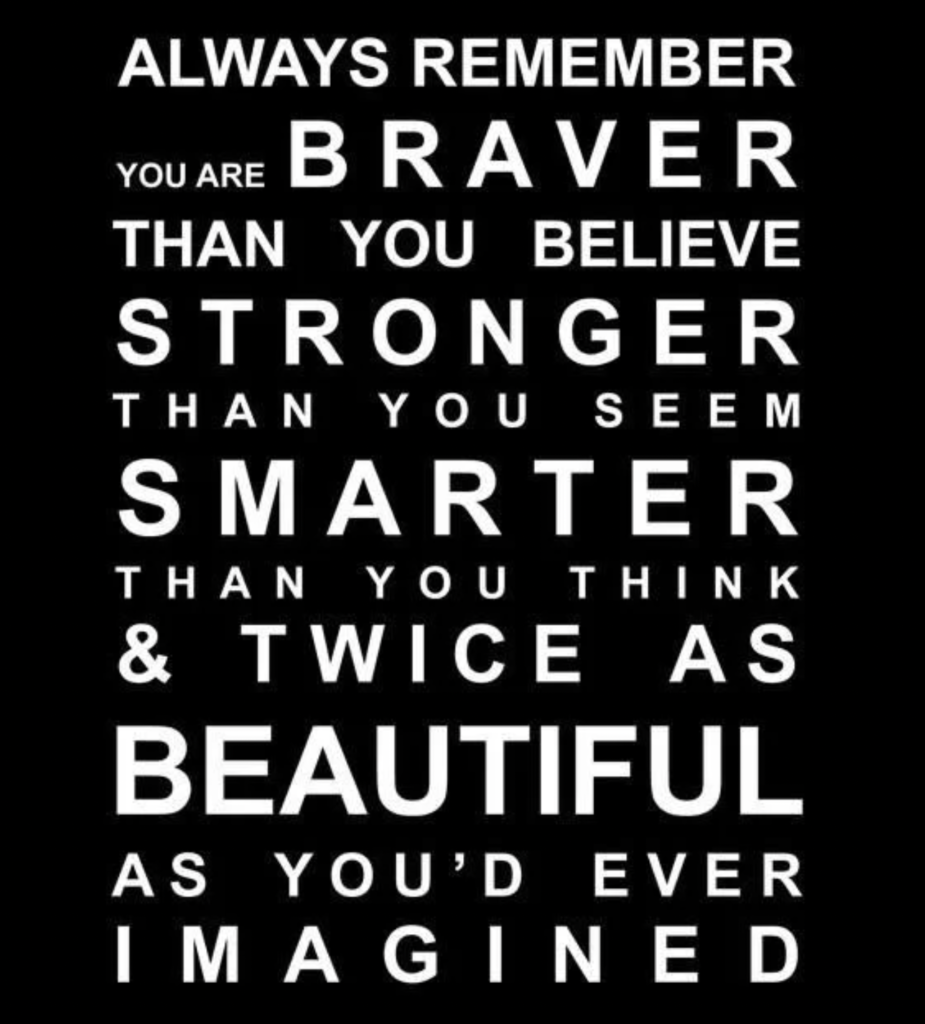 “Always remember you are braver than you believe, stronger than you seem, smarter than you think and twice as beautiful as you’d ever imagined.”