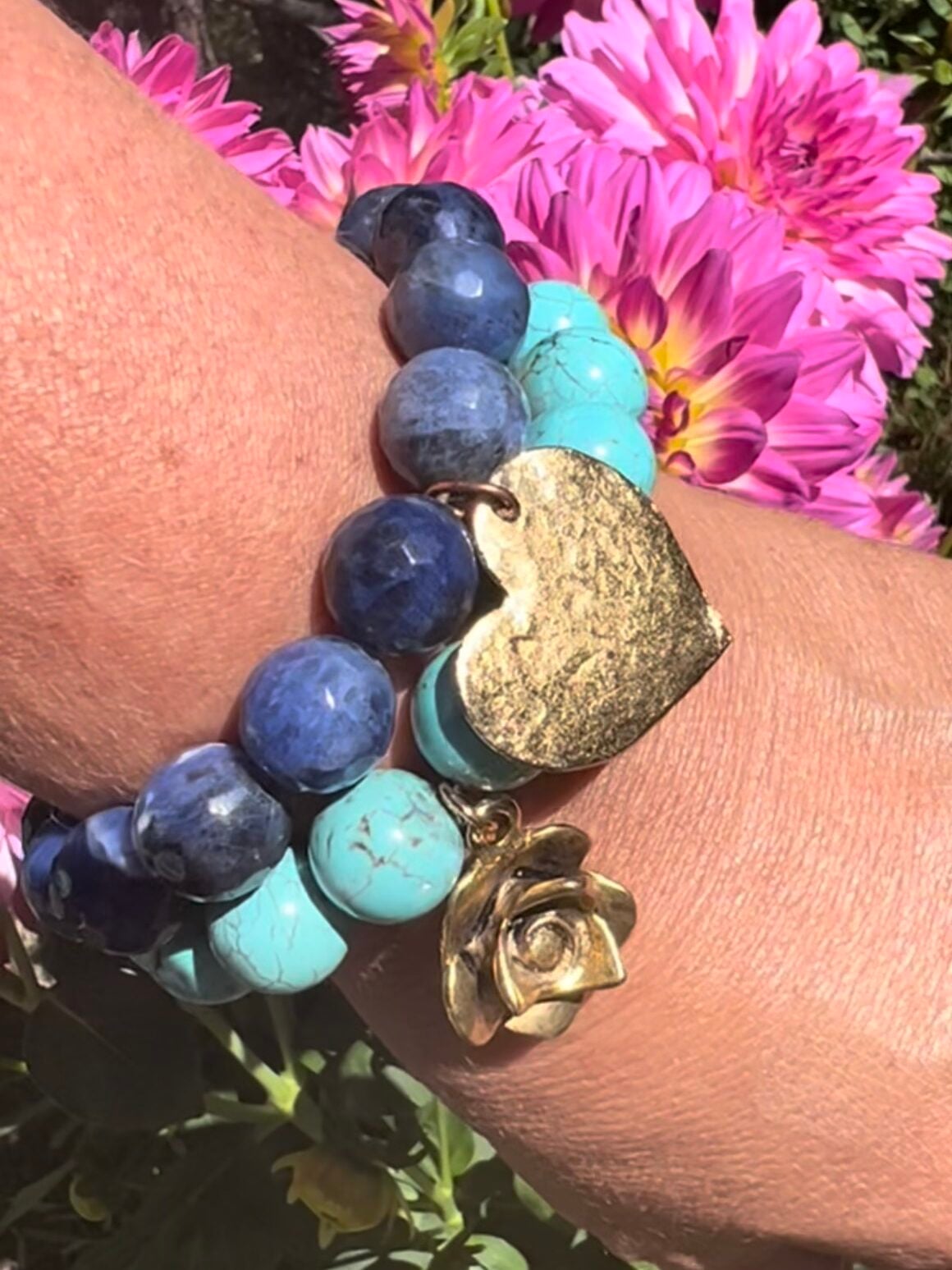 I’m also wearing the turquoise rondel bracelet which alters gold-plated rounds and turquoise rounds. It’s smaller in diameter, but it makes a statement!