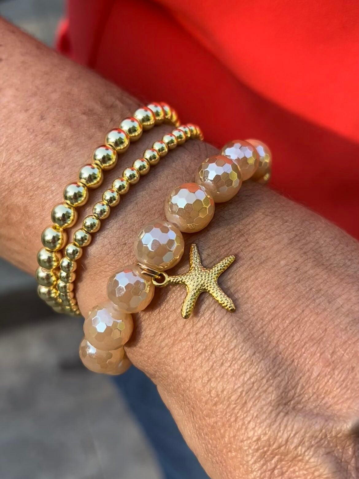 Here’s how I create a wrist stack with the gold charmed bracelets!