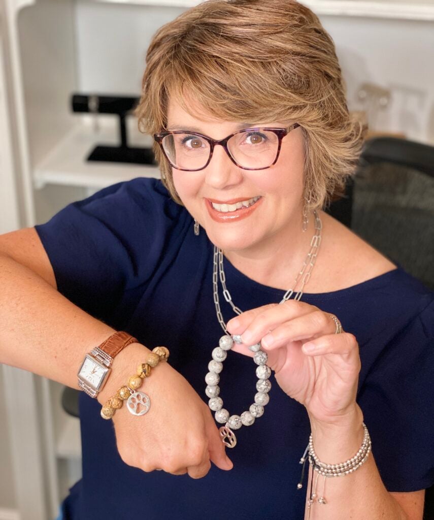 I was wearing a red top with some blue floral details. So, I added the dog paw charm bracelet with silver leaf agate beads to the classics.
